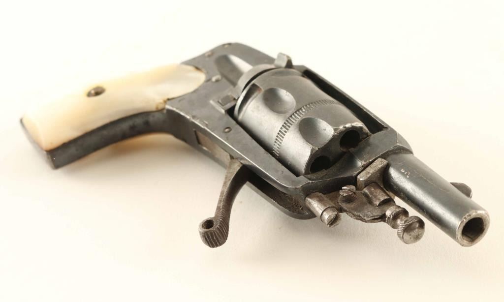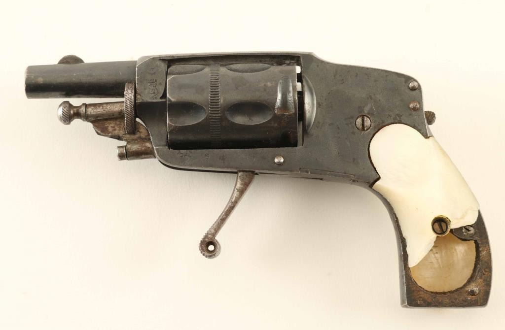 Revolver, 5-shot. Small, compact "Vest pocket" pistol. Folding trigger. 1 1/2" barrel. Blued finish, Mother of pearl grips. Swing-out ejector rod. bore, and cylinder chambers are dark/dirty. Blued finish is about 95%, with chips/scratches. About half of the lower left grip is missing. Small chip out of the lower right grip. Pistol is inoperable. NRA Condition-Poor, Inoperable. Antique Firearm.