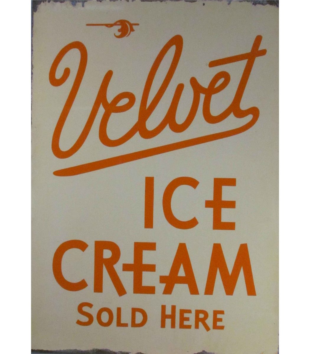 Velvet Ice Cream Two Sided Porcelain Sign. Originally in sidewalk frame. Edge wear otherwise very good condition. 20 X 28 inches.