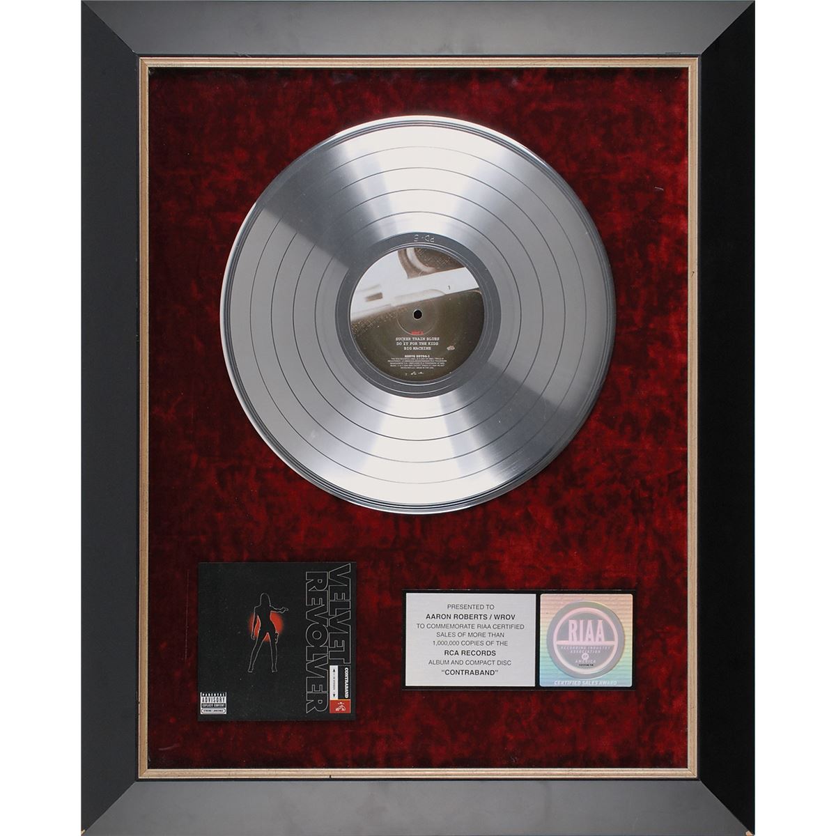 Official ‘R’ serial number hologram-style RIAA platinum sales award presented “to Aaron Roberts / WROV to commemorate RIAA certified sales of more than 1,000,000 copies of the RCA Records album and compact disc ‘Contraband.’” Framed with its disc, plate, and CD album cover to an overall size of 20.25 x 25. Award retains its original backing with a Jewel Box Platinum label. In fine condition, with a chip to each bottom corner of the frame. Oversized.