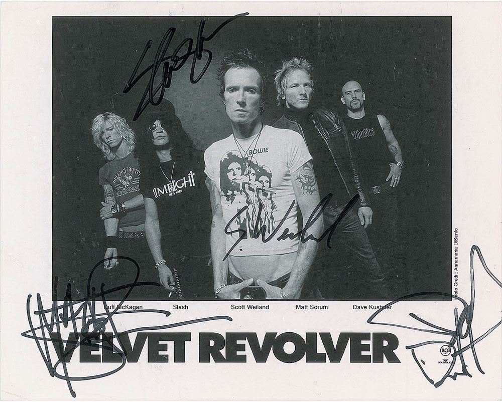 Semi-glossy 10 x 8 RCA publicity photo of Velvet Revolver, signed in black felt tip by Slash, Duff, Matt Sorum, Dave Kushner, and Scott Weiland. In fine condition, with scattered light scuffing.