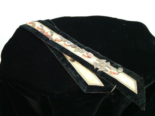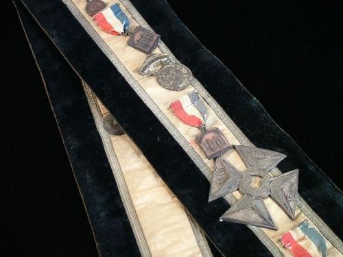 American (20th Century) Velvet sash with 11 different medals for educational and marksmanship achievements, all from Waco, Texas 1940-1941, Right hip buckle reads " In Hoc Signo Vigno" dated 1890, 70" by 10".