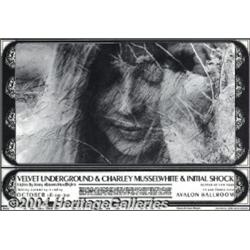 Velvet Underground - Music Memorabilia Poster (Tea Lautrec Litho, 1968). One of the things that set the Family Dog apart from other rock promoters of the sixties was that they liked to "mix it up." They would book Soul, Blues, and Rock all on the same bill to expose the audience to something a little different each time. This show is a great example with the Velvet Underground joined by Blues great Charlie Musselwhite and Rockers Initial Shock. With art by Wes Wilson, this mint poster is one of the toughest of the final Family Dog posters to find. Its overall size is 14" x 20" and it bears the designation FD-142. Important notice: Heritage usually auctions material at the rate of 200-250 lots per hour. On some occasions eBay Live bid software or the Internet may not be able to keep up with the pace of the auction. We recommend placing a realistic absentee bid now as insurance to avoid disappointment. Occasionally the auctioneer may eliminate or reject an eBay Live bid, and the auctioneer may also reopen a lot after the close of the eBay live bidding (usually because we missed an audience bid), and may reject your bid even if it shows you as the winning bidder. By bidding via eBay Live, you agree that Heritage may award the lot to another bidder at its sole discretion under the circumstances described above or any other reasonable circumstances. Since eBay bids are not shown to us until we open the lot on the floor, we treat those bids just like floor bids. In most cases the floor responds before the eBay bid is presented to us, due to Internet lag time, so for consistency we have made it a policy that floor bids are always considered first over tie eBay live bids. Also please note that all Heritage lots purchased through eBay Live carry a 20% Buyer's Premium. Please make sure you read the Terms and Conditions before you bid.