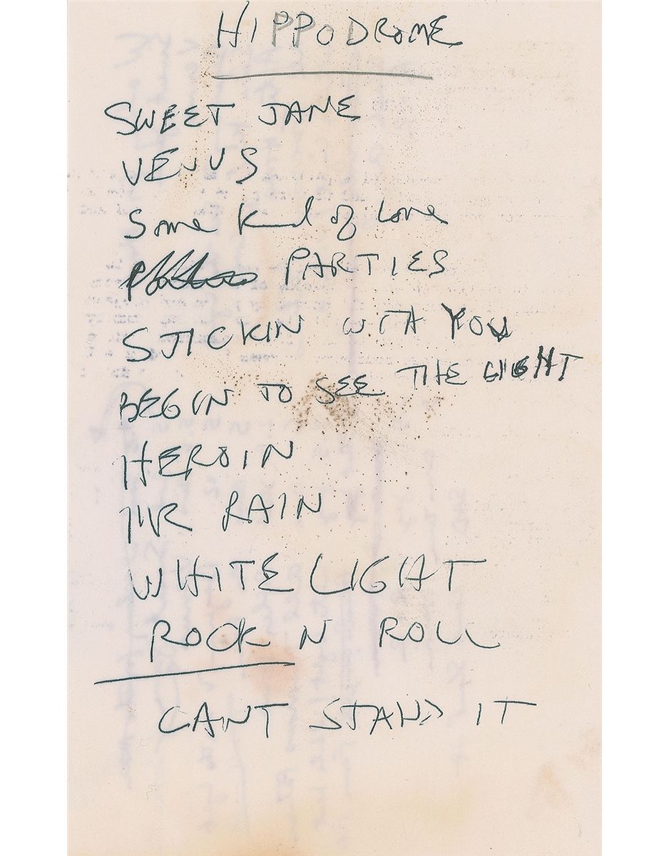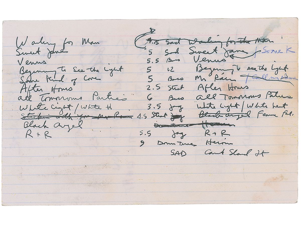 Handwritten set list for a 1993 Velvet Underground reunion show, held at the Hippodrome de Vincennes in Paris, France on June 26, 1993, written out by guitarist Sterling Morrison on both sides of a 5 x 8 off-white card. On one side, Morrison writes the venue’s name and the 11 songs being performed, including ‘Sweet Jane,’ ‘Heroin,’ ‘Mr. Rain,’ and ‘White Light.’ On the reverse, Morrison writes out the song list again, as well as a breakdown of which guitar he will use and the approximate length of each song. In fine condition, with some scattered rippling and toning. Set list originates from Morrison’s widow, Martha.