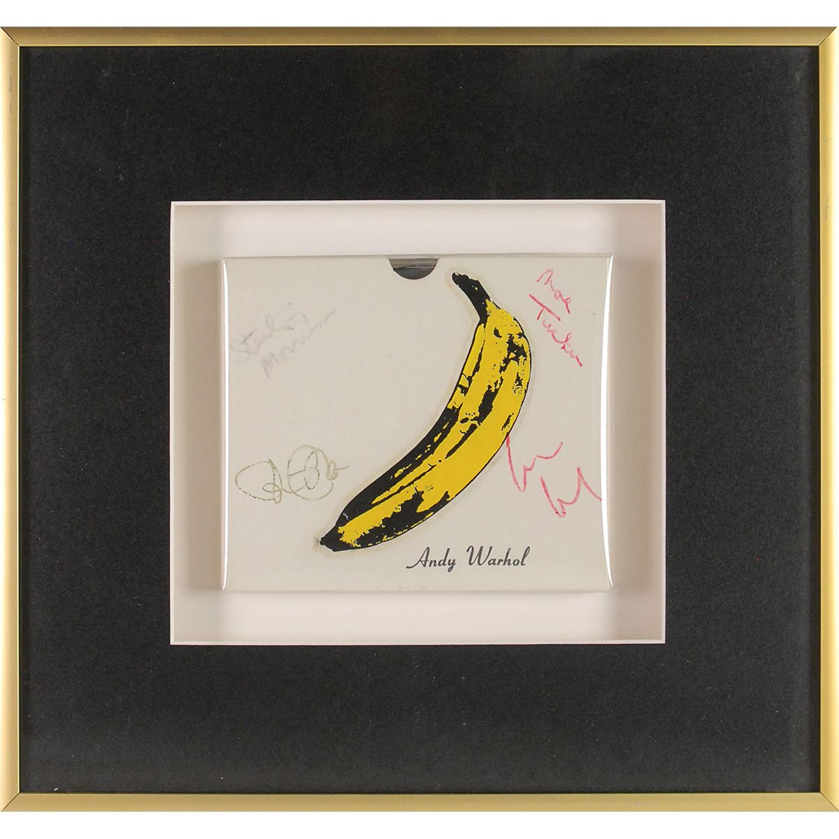 The Velvet Underground and Nico CD signed on the front cover felt tip by Lou Reed, Maureen Tucker, John Cale, and Sterling Morrison. Matted and framed to an overall size of 12.5 x 12. Irregular ink adhesion to all signatures, otherwise fine condition.