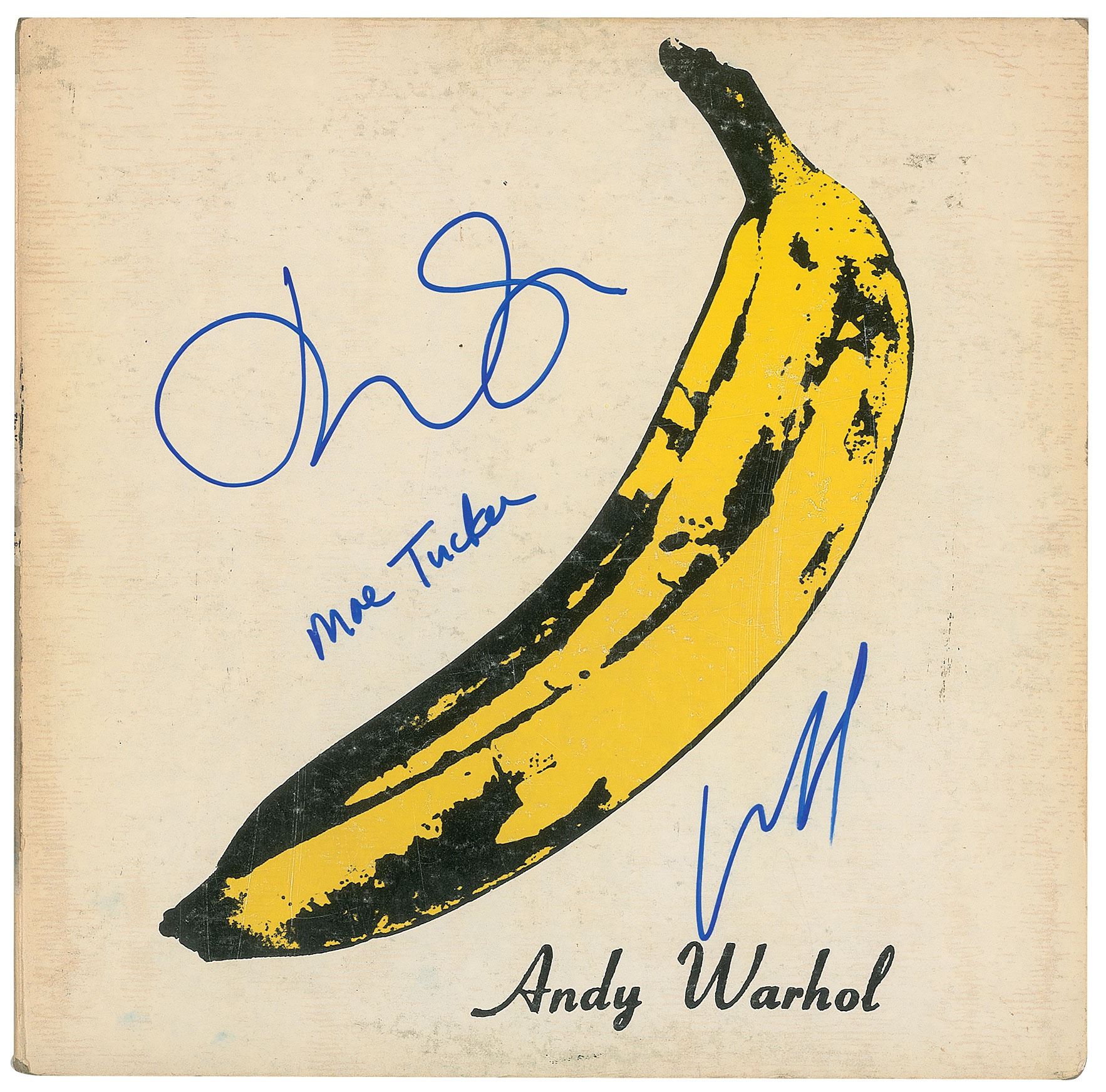 The Velvet Underground & Nico album signed on the front cover in blue felt tip by Moe Tucker, John Cale, and Lou Reed. In very good to fine condition, with light scuffing and edge toning. The record is included.