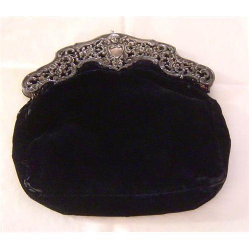 Antique Velvet Victorian Evening Purse           Circa. 1880  American.  German silver (nickel) frame.  Original black velvet exterior, slightly worn around the edges.  Original purple lining, slightly worn, but certainly usable.  Small interior pocket for mirror.  Certainly large enough for cell phone and blackberry.  Hand-made.  Wonderful detail work on nickel frame.