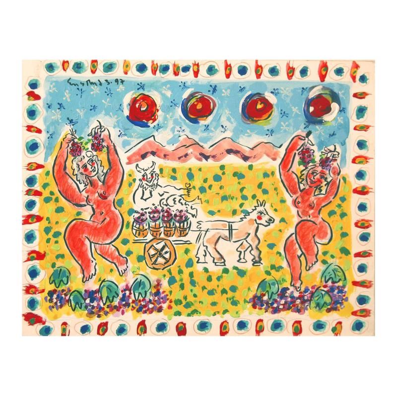 "Vendange" is an original Mixed Media on Board by Wayne Ensrud. The piece is hand signed by the artist and comes with a Certificate of Authenticity. Measures approximately 11" x 14".