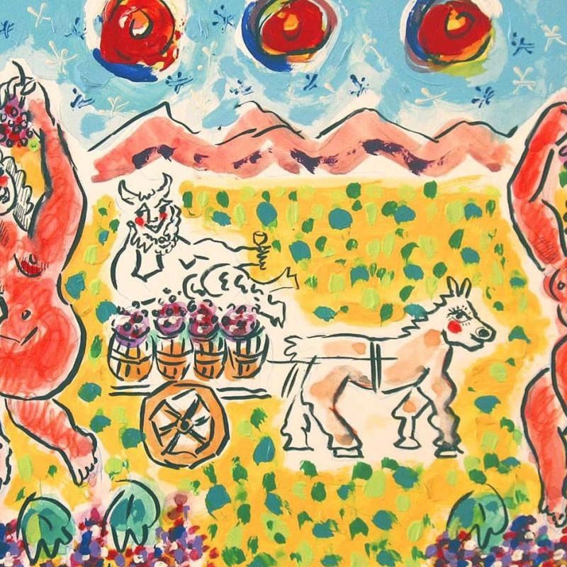 "Vendange" is an original Mixed Media on Board by Wayne Ensrud. The piece is hand signed by the artist and comes with a Certificate of Authenticity. Measures approximately 11" x 14".