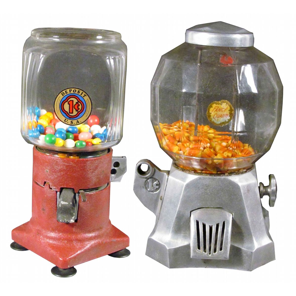 Vendex Jar Ball Gum Vendor. 1935, Vendex Co. Cast iron. 12 inches tall. And a Magna Vendor. Ca. 31 by the National Mfg. Co. The globe is 16 sided and the aluminum base is 8 sided. 14 1/2 inches tall. Both in Excellent all original working condition.