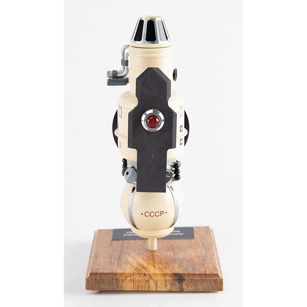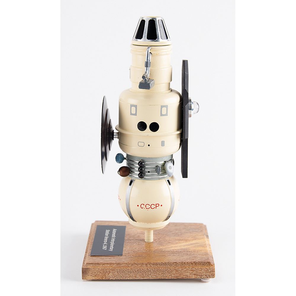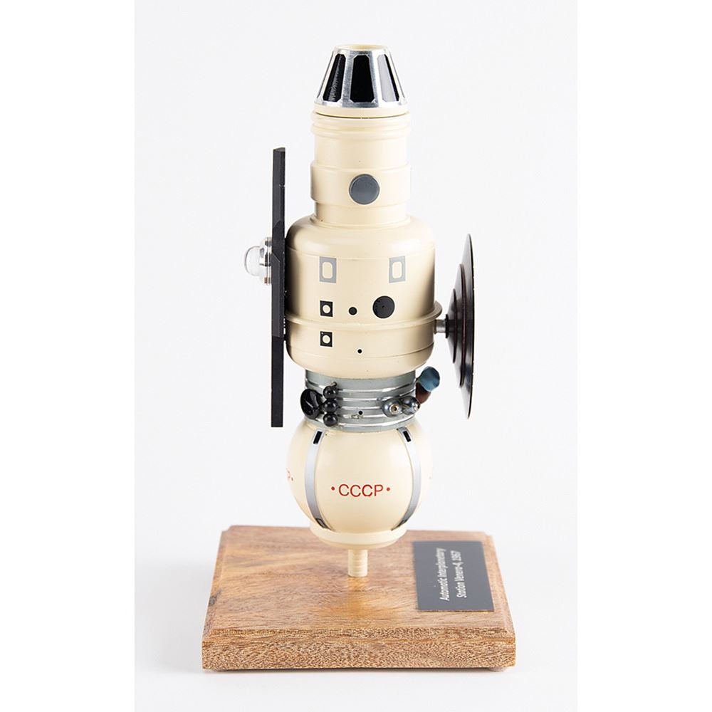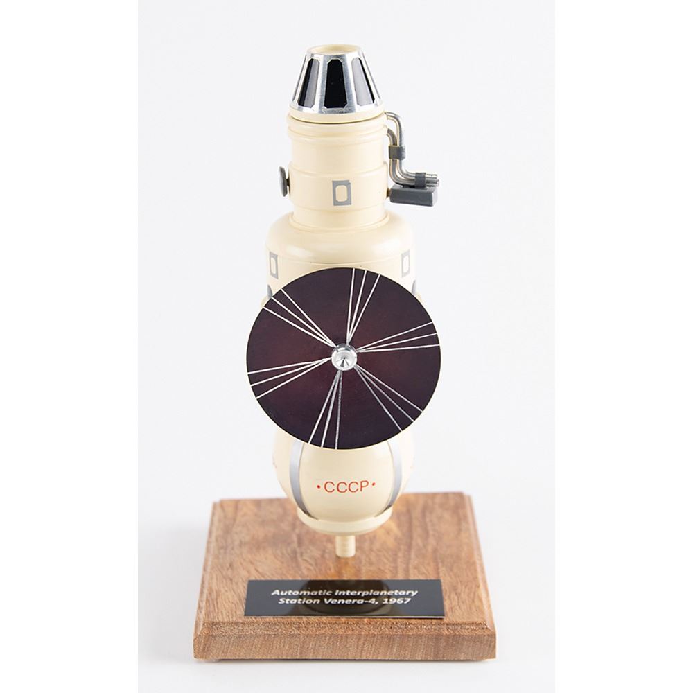 Rare custom model of the Venera 4, a probe in the Soviet Venera program for the exploration of Venus, which, in 1967, became the first successful probe to perform in-place analysis of the environment of another planet. This highly detailed handmade model is constructed of metal and resin composite elements, stands 9.5˝ in height, extends to 9˝ in width, and is set upon a wooden 4.75˝ x 4.75˝ base with an affixed plate reading: “Automatic Interplanetary Station Venera-4, 1967.” The Venera 4 model consists of orbital and lander modules, parabolic and low gain antennas, solar panels, and a magnetometer bracket. In fine condition.