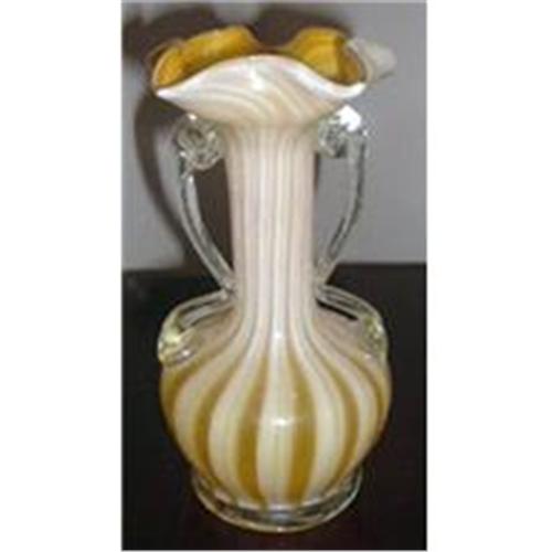 <table width="100%" border="0" cellspacing="0" cellpadding="4"><tr><td><em> </em></td></tr><tr> <td width="100%"> Believed to be Venetian Art Glass this beautiful yellow and white swirled hand blown centerpiece vase stands 9" tall x 4 1/2" at its widest point. The top edge is beautifully ruffled while the handles are clear and hand blown. Stunning bright yellow coloring, striped with white and in excellent condition. </td></tr><tr> <td> </td></tr><tr> <td>Reference #: aaVAGHBCV</td></tr><tr><td>Condition:Excellent</td></tr><tr><td>Year:1930-1950s</td></tr><tr><td>Title:Venetian Art Glass Hand Blown Centerpiece Vase</td></tr><tr><td>Location:Orlando, Florida</td></tr></table>