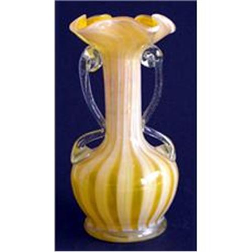 Believed to have been produced in Venice, circa 1940, this beautiful yellow and white swirled hand blown Art Glass centerpiece vase stands 9" tall x 4 1/2" at its widest point. The top edge is beautifully ruffled while the handles are clear and hand blown. Stunning bright yellow coloring, striped with white and in excellent condition.