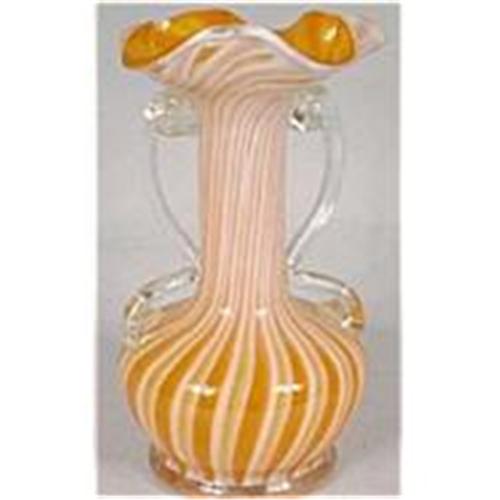 Antique Victorian designed Venetian blown glass vase incorporating varicolored glass canes of white, pink and melon cased in clear crystal. Top is wide ruffled and complimented with two applied crystal clear handles. Styled with bulbous base, slender neck and wide crimp ruffled rim.<BR><BR>Measures 9 inches high and 4.5 inches at the widest point of the bulbous base. Rated to be in wonderful condition. Delicate in appearance, however substantial in weight. Indented pontil.<BR><BR>