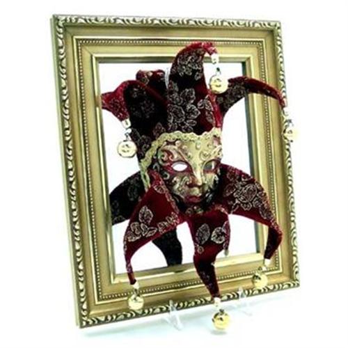 Venetian velvet female jester mask is handmade in Venice, Italy. The face is paper mache, hand-painted and decorated in an intricate Baroque pattern using gold leaf, glitter and brocade trim. The velvet hat points are in a sparkling flower pattern and finished with pearls and bells. We have exclusively framed the mask on an elegant gold mirrored frame with a picture hanger back.