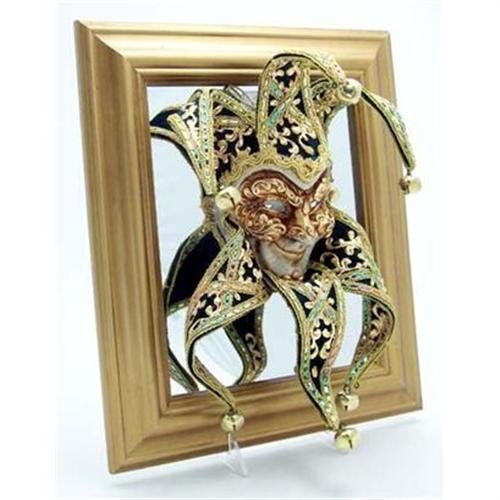 Venetian male jester mask is handmade in Venice, Italy. The face is paper mache, hand-painted and decorated using gold leaf. The dark green velvet hat points are in a sparkling harlequin pattern, trimmed in ribbon and finished with bells. We have exclusively framed the mask on an elegant gold mirrored frame with a picture hanger back.