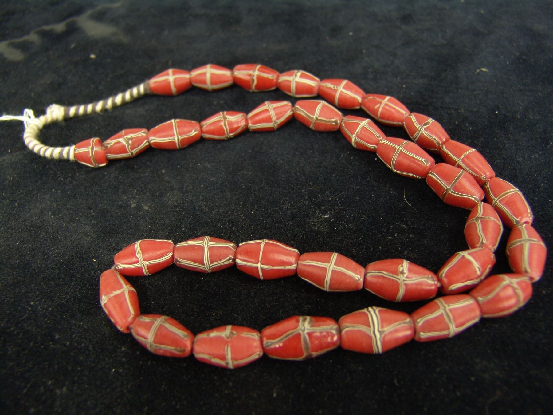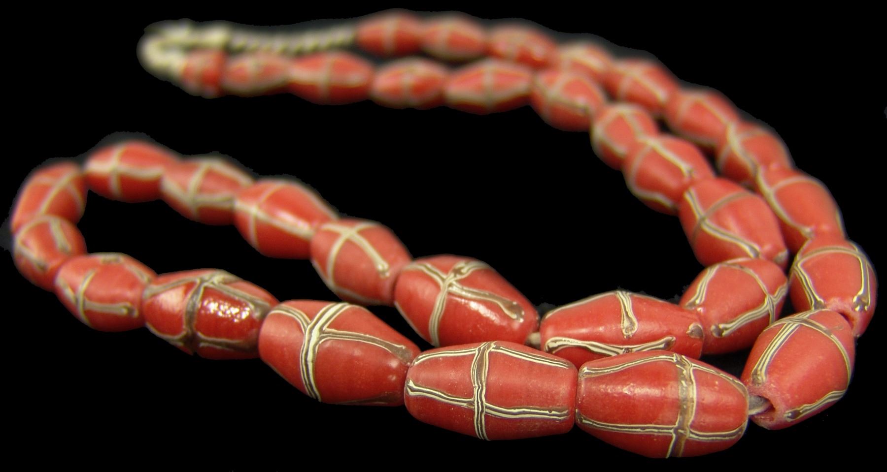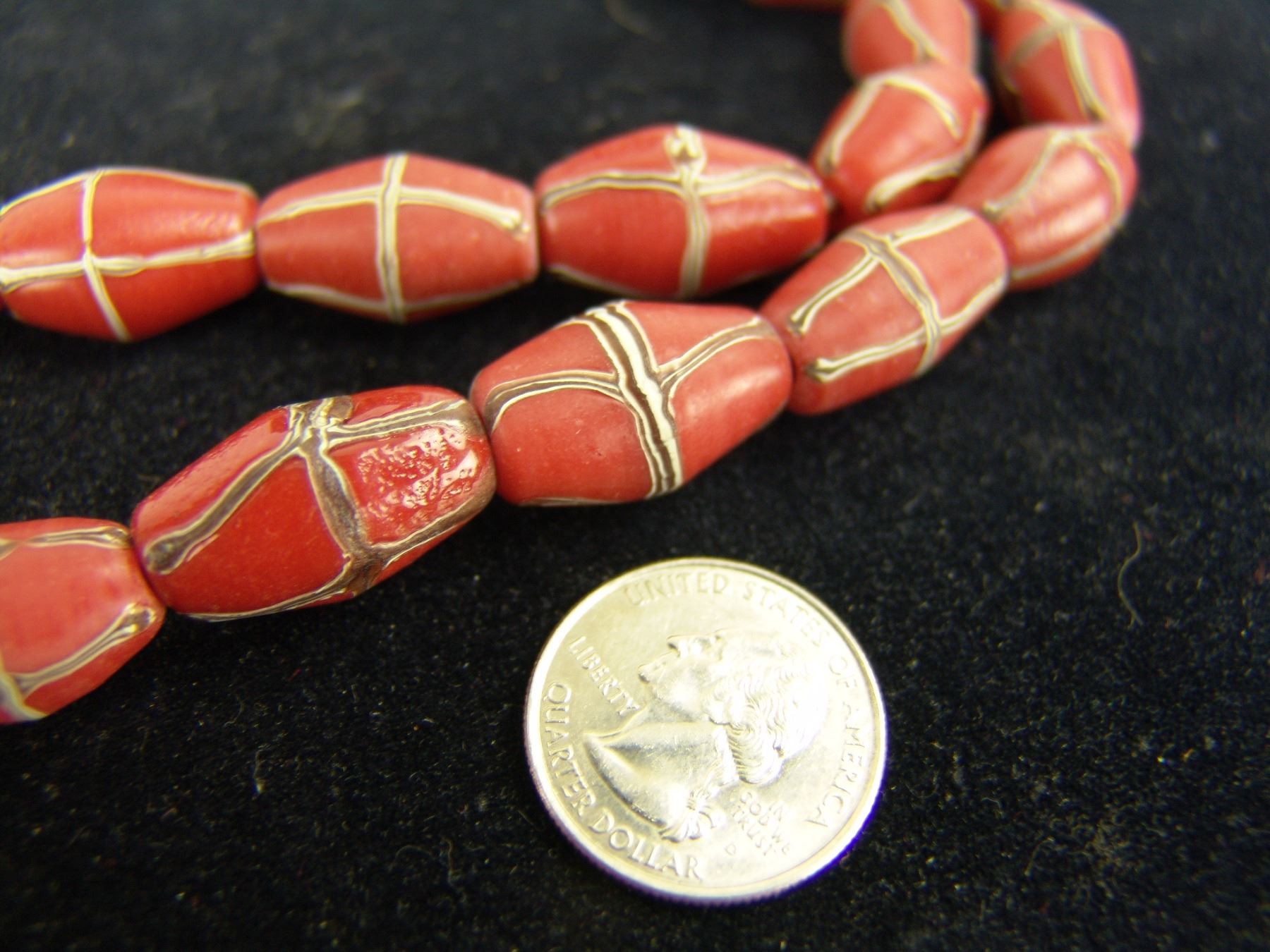 Beautiful strand of 32-1/2" tapered (coral red) "French Cross" trade beads (approx 1" each.) Very good condition, minor flaws., Mid 1900s, 32"
