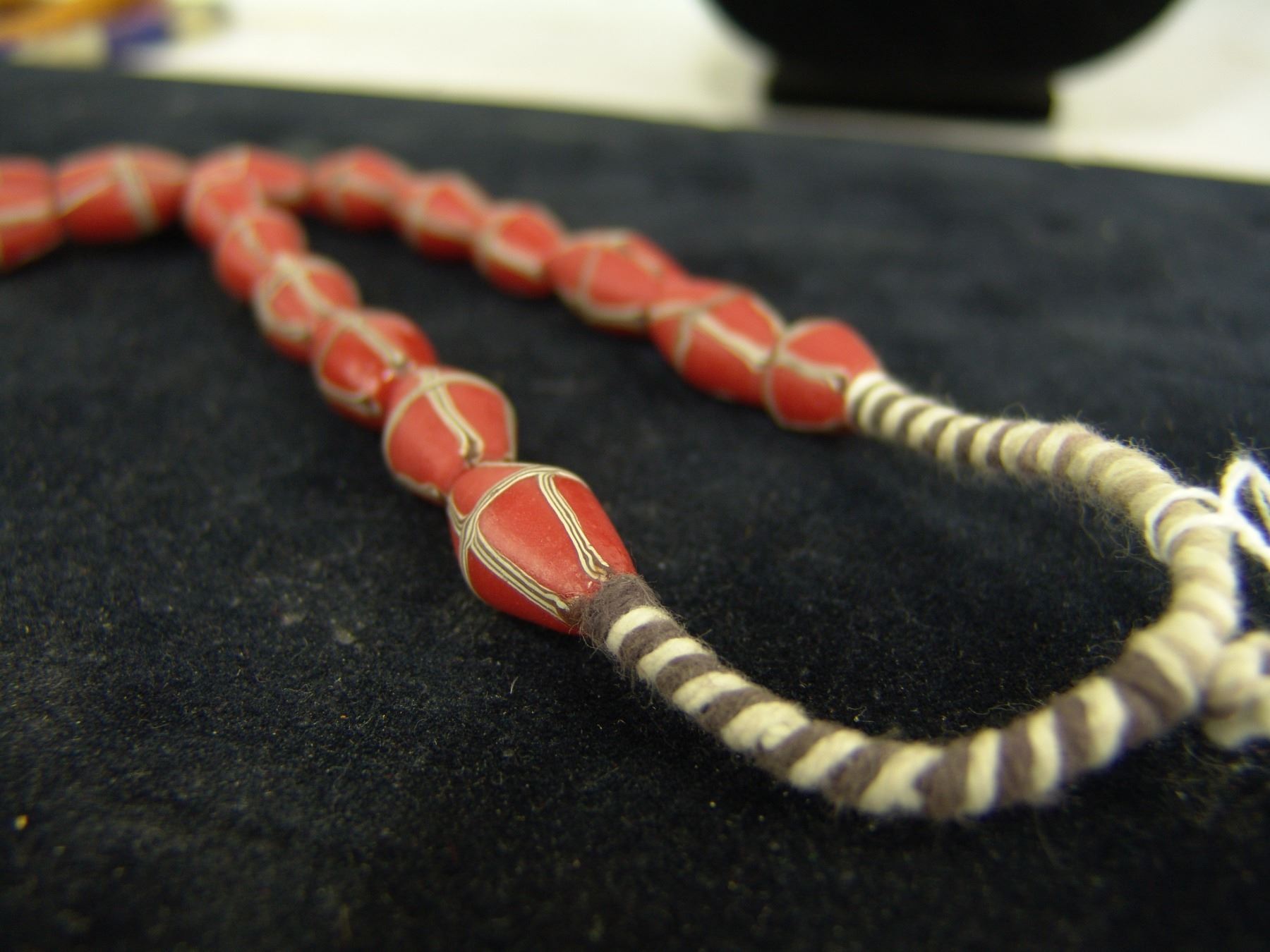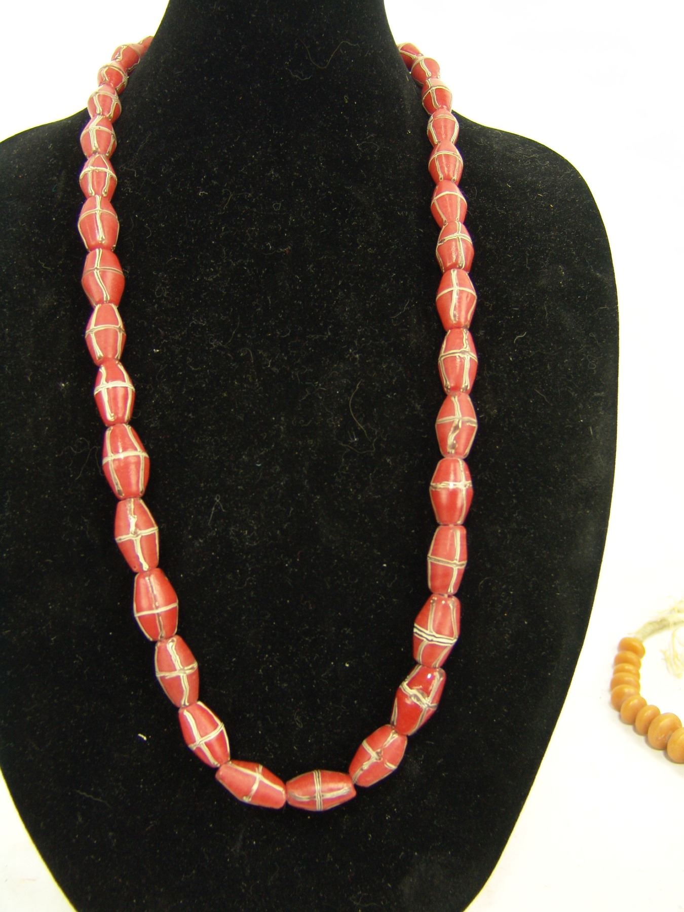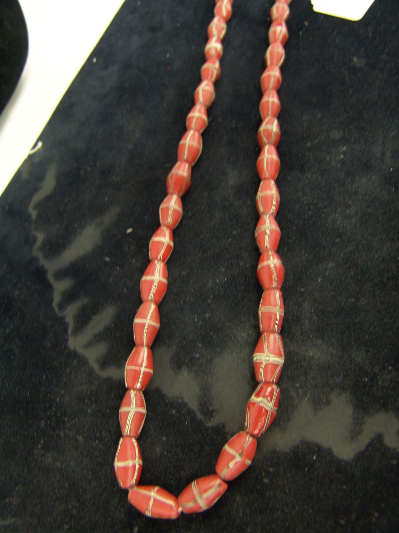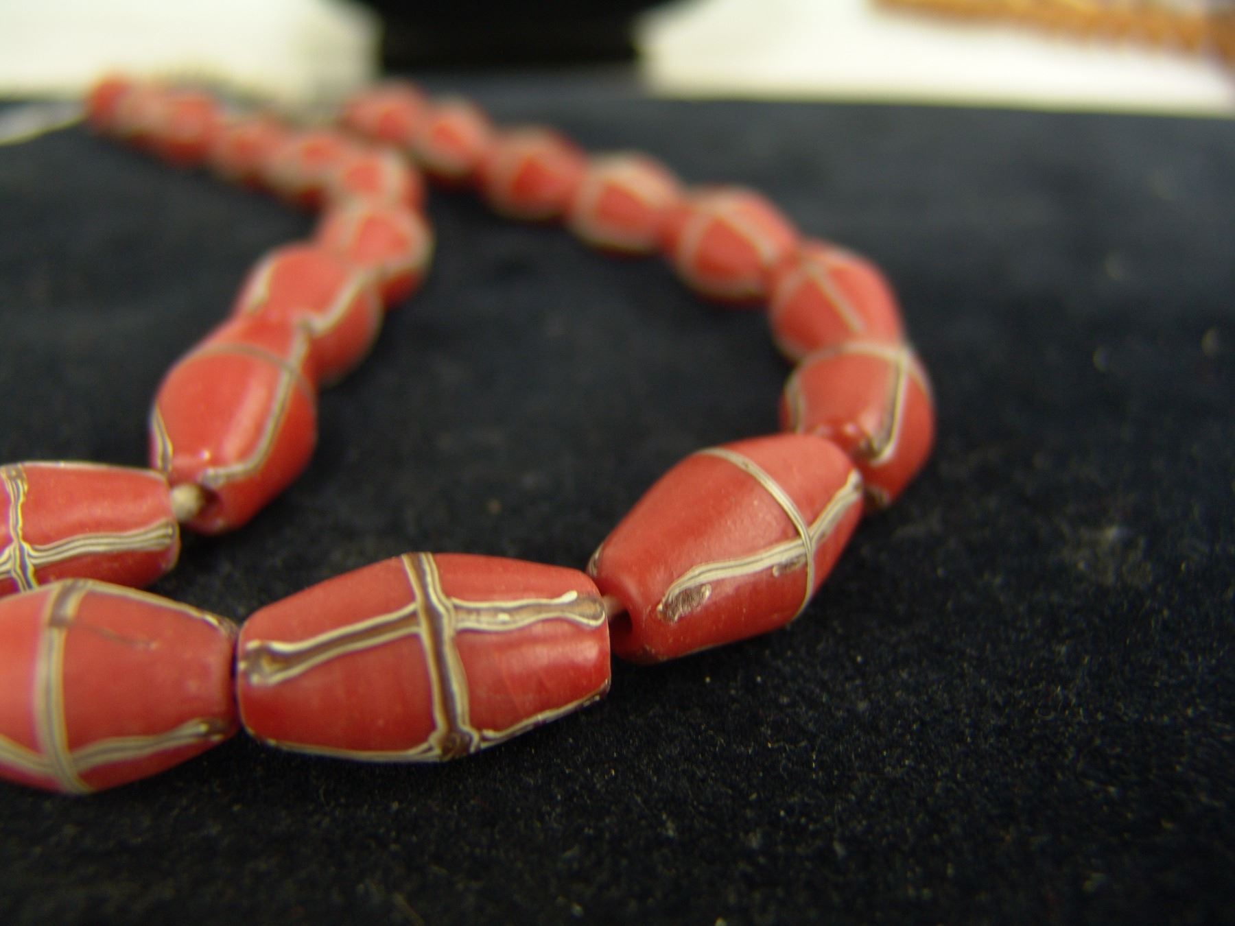 Beautiful strand of 32-1/2" tapered (coral red) "French Cross" trade beads (approx 1" each.) Very good condition, minor flaws., Mid 1900s, 32"