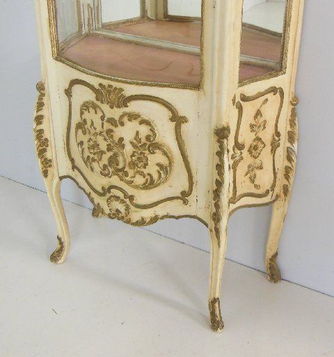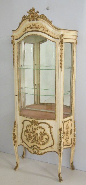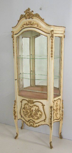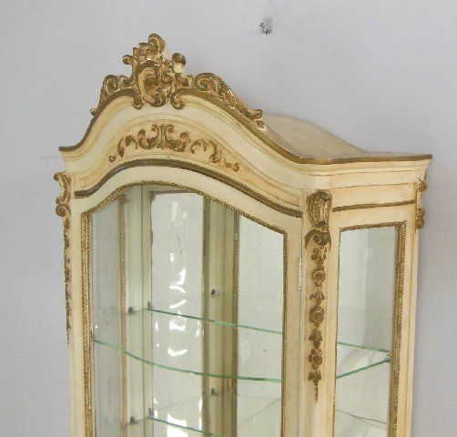 Cream with gold highlights, curved glass, mirrored back, glass shelves. Approx. 70" X 28" X 14.5" D.