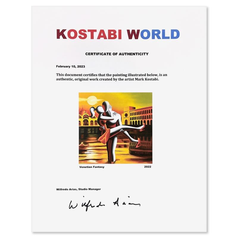 "Venetian Fantasy" is an original oil painting on canvas by Mark Kostabi, hand signed by the artist. This piece comes framed. Includes Letter of Authenticity. Measures approx. 25.5" x 25.5" (frame), 21" x 21" (image).