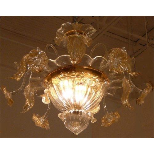 This is a graceful and elegant Venetian glass chandelier with gold murine accents.six lights. It is wired for USA use and makes a gorgeous addition to any interior.