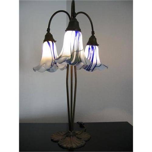 Vintage Venetian glass/brass table lamp with three drops of ruffled art deco glasses. the colors light and dark blue along with soft and a shade of light blue background with touches of greens. this lamp is magnificent !in excellent working and looking condition. i recently paid to an electrician to look at it and to be certain that it works properly prior to my listing. the glasses w metal hooks and leaf pattern base, most likely is brass or bronze. it is gorgious!!! multi functional for desk or table. it is tall and measures 27 ". - 15 " w. with 6.5 each glass in diam. base is covered with felt and measures 8 ".