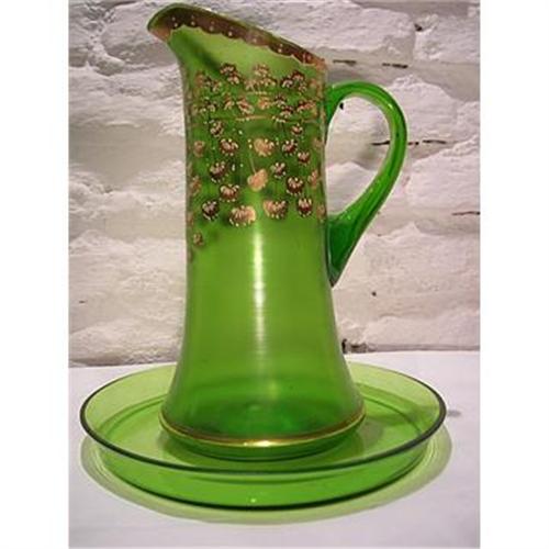 Venetian Green Jug with gold enamel. Made in glass, without any sign. In excellent conditions to home use or decoration use. Probably for juices or Cocktels. The flowers has a little relief, but totally painted by hands. The plate doesn?t have any decoration.