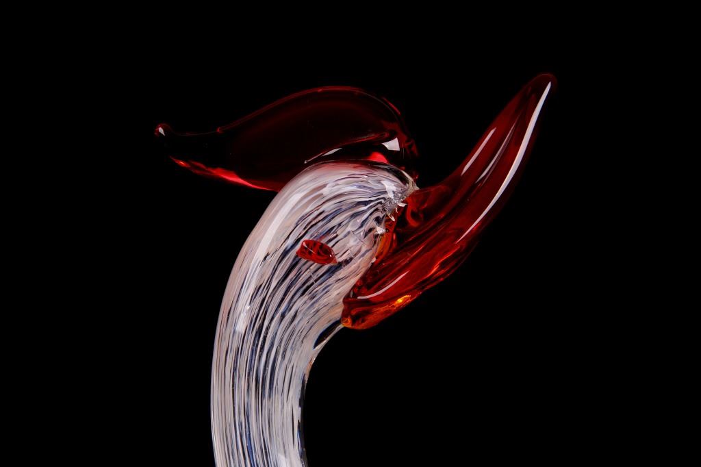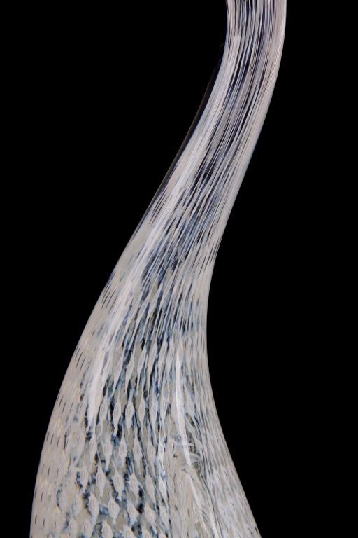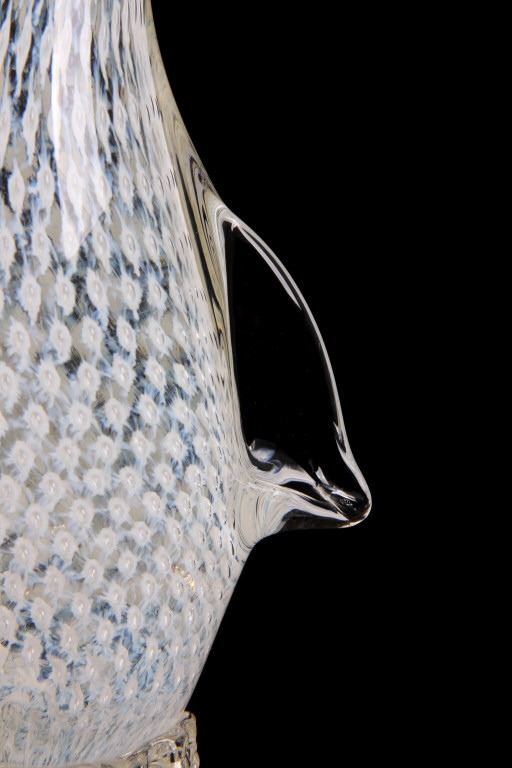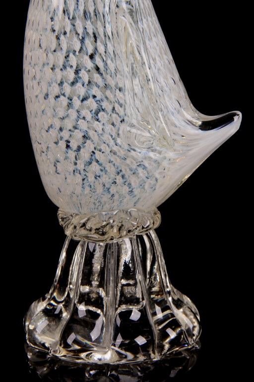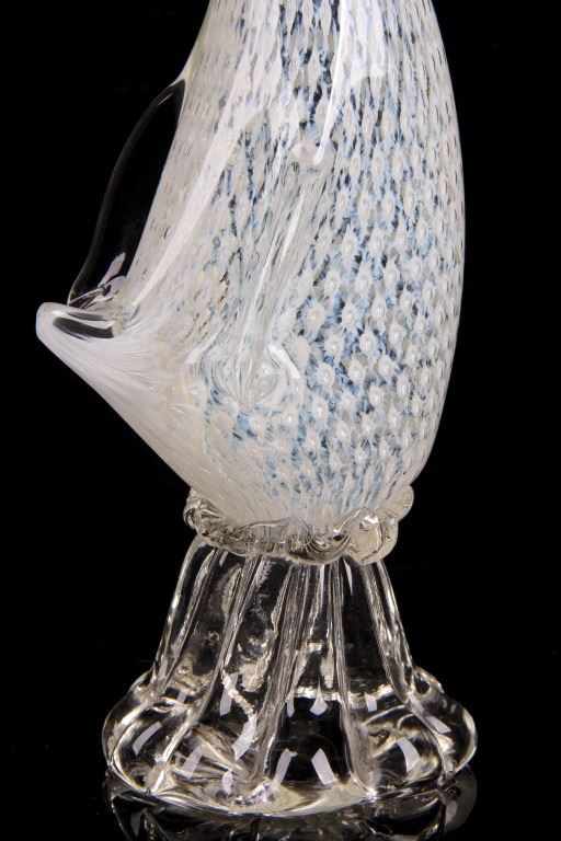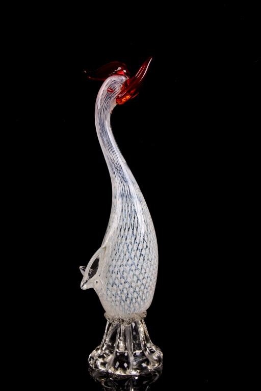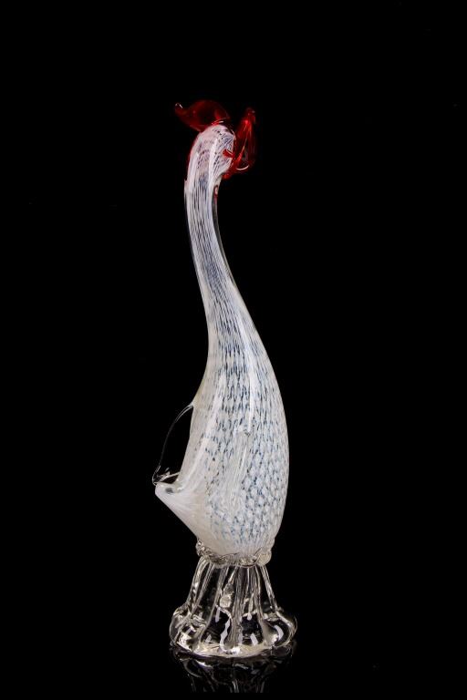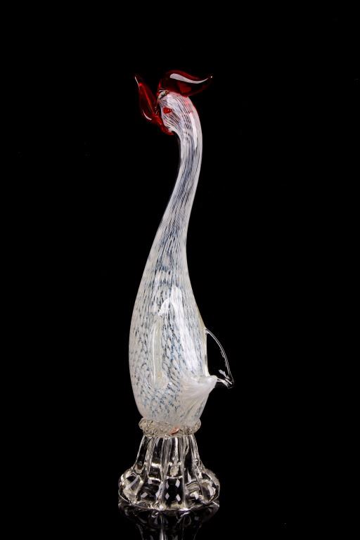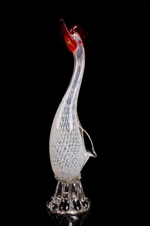 Featured in this lot is this Venetian Latticino figural glass bird. The bird shows a wonderfully constructed figural chicken from textured and colored glass. Latticino is an Italian decorative glassblowing technique. Latticino refers to any glass piece created using colored glass canes. The condition of this glass figural bird is good, with no obvious signs of damage. The measurements of this Latticino glass bird are 15" x 3 3/4" x 3 3/4".