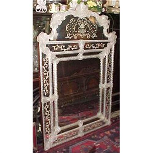 This is a magnificent Venetian Mirror with etched glass and hand made glass rosette flowers. This is a stunning accessory and will make a dramatic statement on any wall!