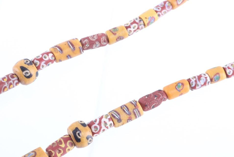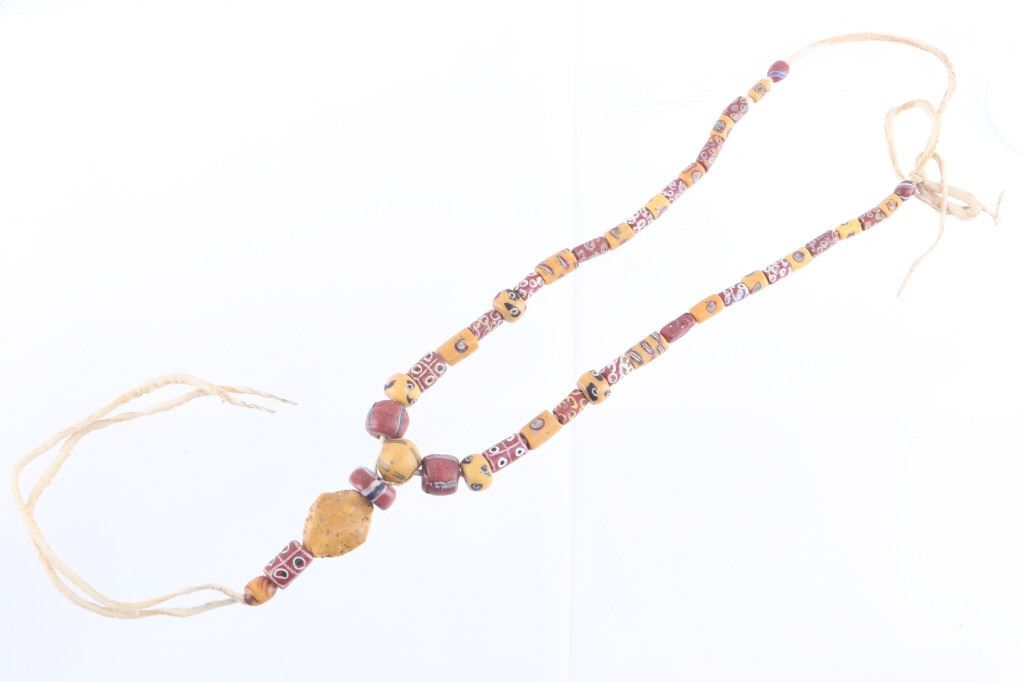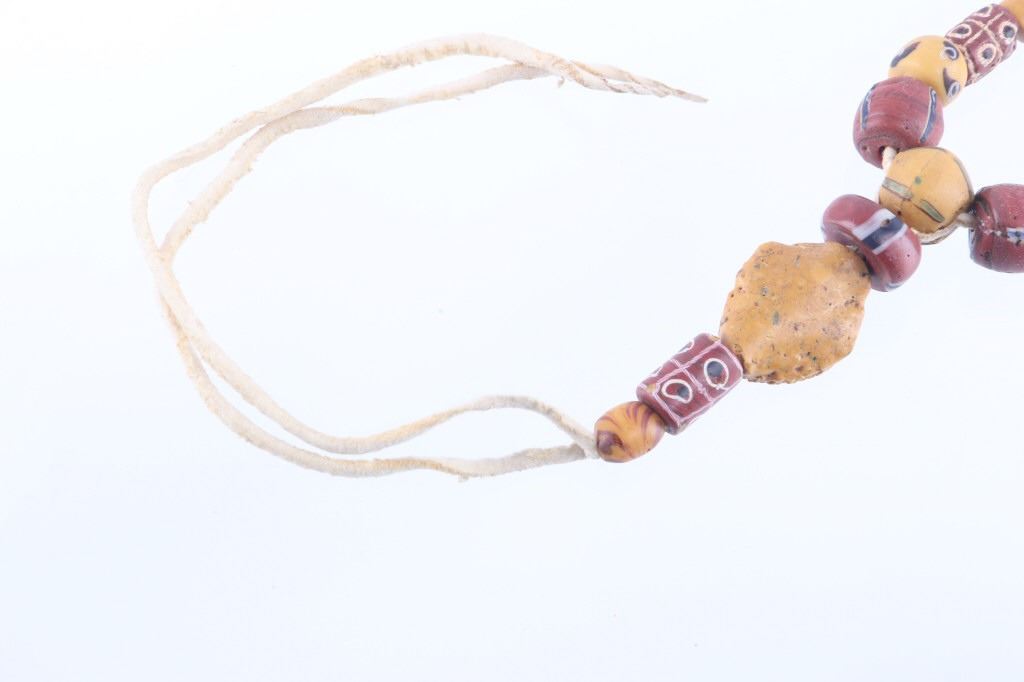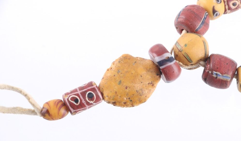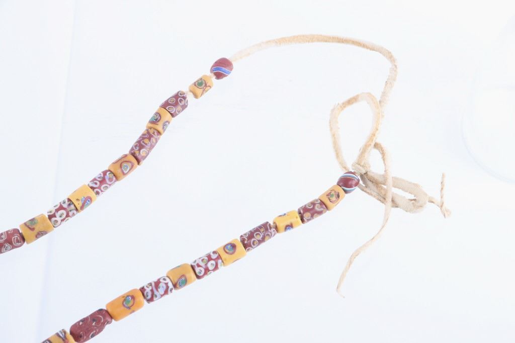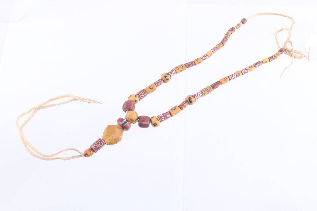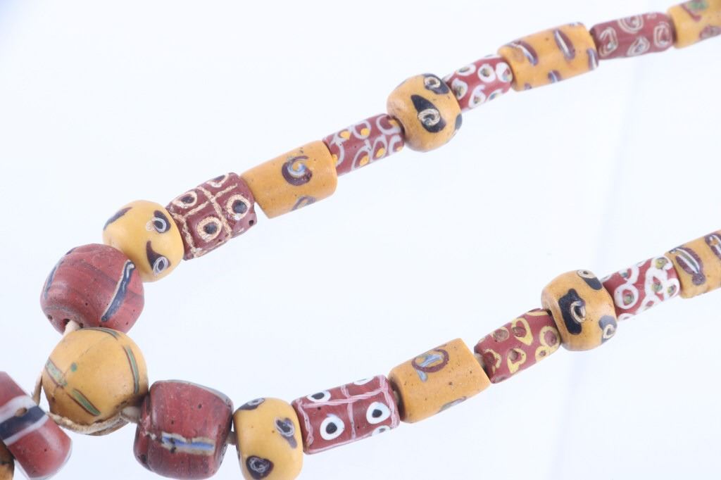 For your consideration is an early Roman Eye trade bead necklace. “Eye Beads” is a name that derives from the distinctive spots on the outer skin of the bead. The beads are strung on soft buckskin. Each bead is uniquely shaped with white, brown, red, blue, black, and yellow design. There are forty-three beads on this necklace. Three of these beads are Tick-Tac-Toe Eye beads. Six of the beads are striped beads; the rest are types of "Eye" beads and one bead is a "chunk" design. The beads are round or cylinder shaped and average 1/4"-1/2" long. This necklace measures approximately 23" in circumference. The necklace has a center "pendant" of three beads and the "chunk" bead, which hangs down 2 1/2". The beads and this necklace are in good condition.