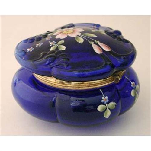 Large cobalt blue Venetian style glass trinket box decorated with enamel flowers and bronze trim. In good used condition with minor signs of wear as shown. Please ask questions, request photos and shipping costs before bidding.