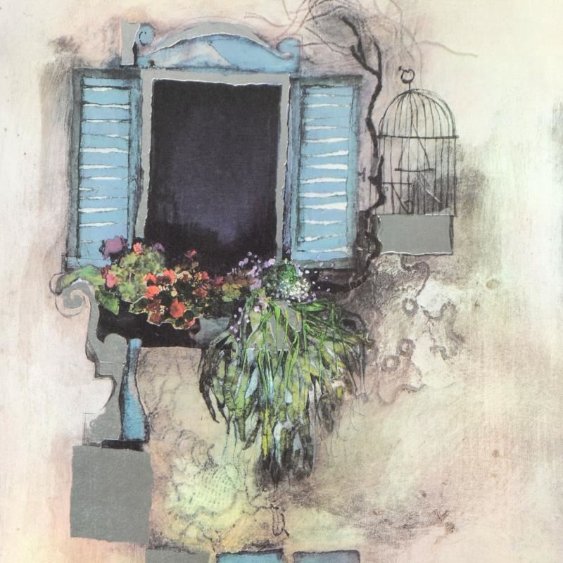 "Venetian Window" is a limited edition lithograph on paper with silver leaf by Rosina Wachtmeister, numbered and hand signed by the artist. Includes Letter of Authenticity. Measures approx. 23.5" x 31" (border), 17" x 25" (image).
