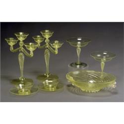 Consisting of a pair of three-light candelabra, a pair of compotes and a centerbowl with applied gold-flecked floral handles. Together with a pair of finger bowls with undertrays. Crack to bowl.