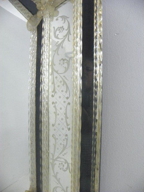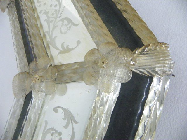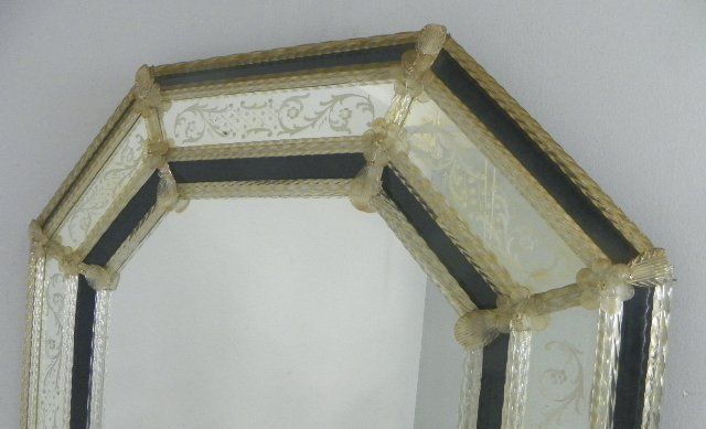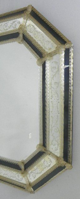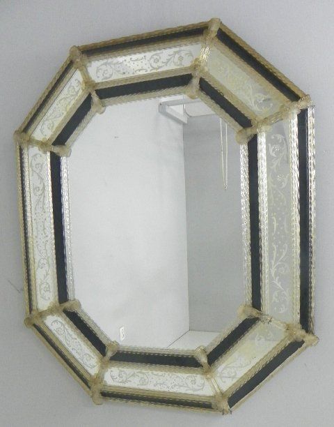 Octagon shaped. With 16 glass flowers, etching throughout perimeter of mirror & ornate glass shapes. Approx. 46" x 39" Please read our terms of sale.