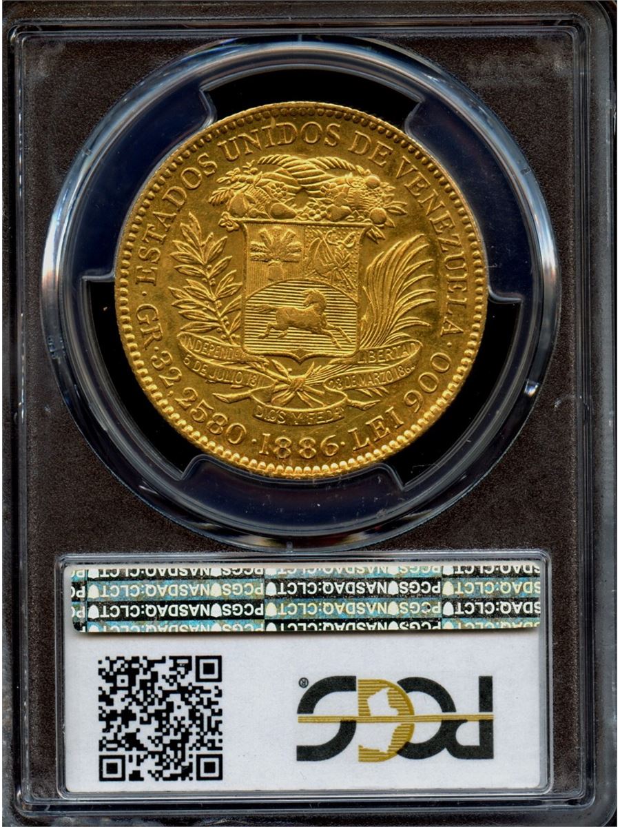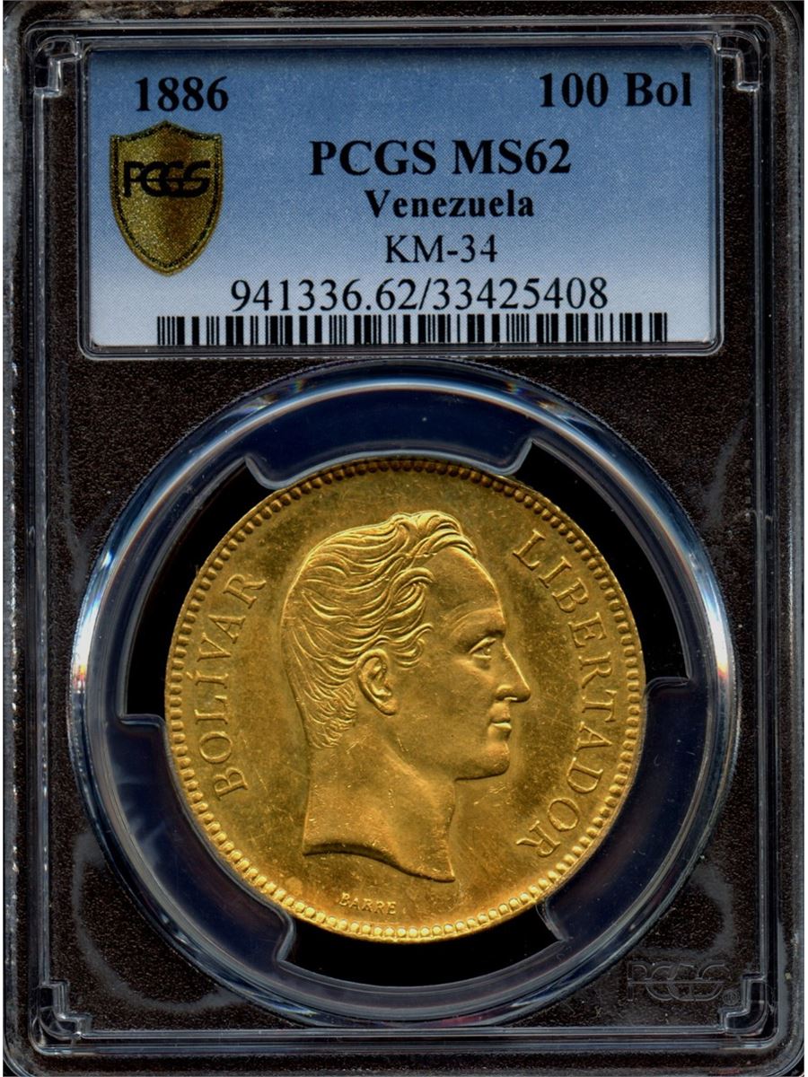 Venezuela 1886, Gold 100 Bolivares, KM 34, A top quality specimen which is rare in uncirculated grades, PCGS certified MS-62