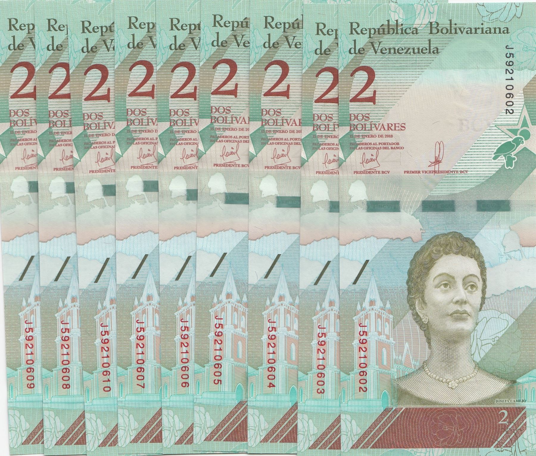 Venezuela, 2 Bolivares (9), 2018, UNC, (Total 9 banknotes)br/serial numbers: J 59210602-10