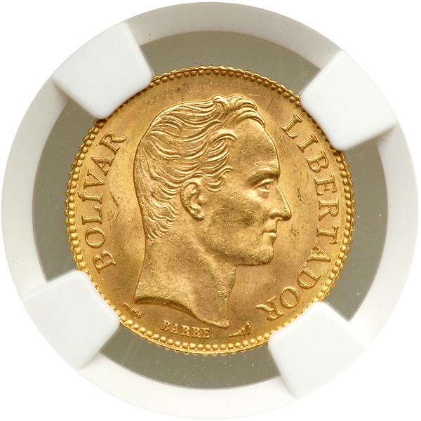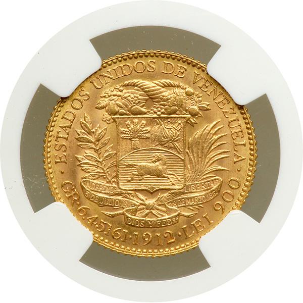 Venezuela. 20 Bolivares, 1912. Fr-5c; KM-Y32. Weight 0.1867 ounce. Head of Bolivar right. Reverse: Arms. NGC graded MS-63.