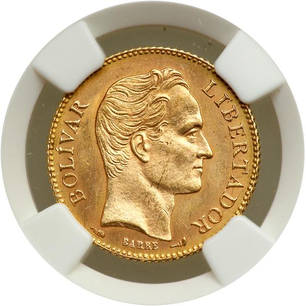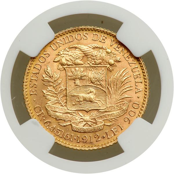 Venezuela. 20 Bolivares, 1912. Fr-5c; KM-Y32. Weight 0.1867 ounce. Arms. Reverse: Head of Bolivar right. NGC graded MS-63.