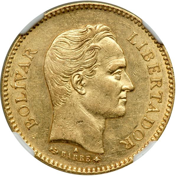 Venezuela. 5 Venezolanos (25 Bolivares), 1875-A. Fr-4; KM-Y17. Head of Bolivar right. Reverse: Arms. Lustrous. NGC graded AU-55.