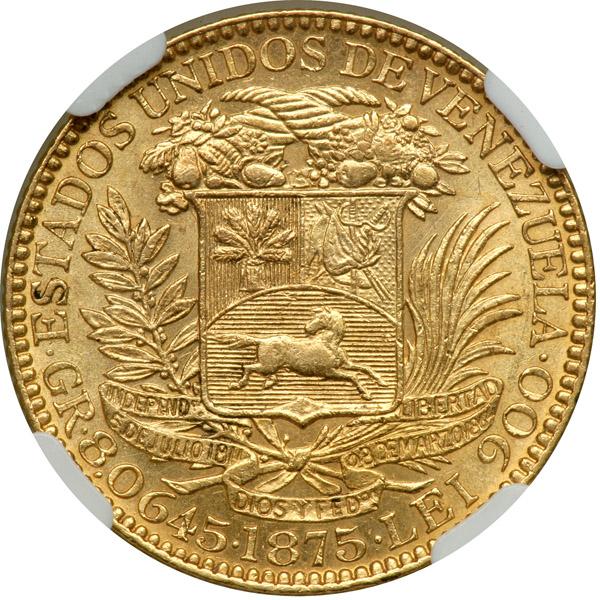 Venezuela. 5 Venezolanos (25 Bolivares), 1875-A. NGC AU55