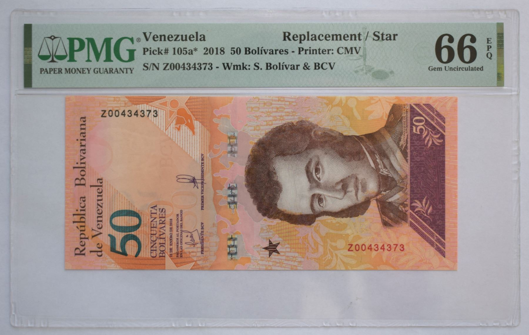 Venezuela, 50 Bolivares 2018, "Replacement / Star Note" Wmk Bolivar & BCV Gem UNC-66 "EPQ" PMG Cert.