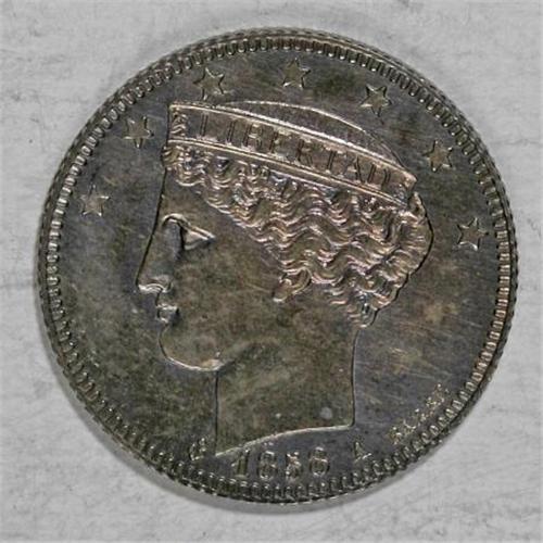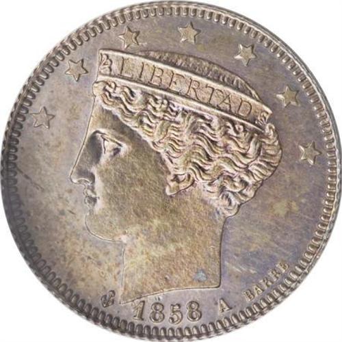 <B>Republic 2 Reales 1858A,</B></I> KM-Y10, Choice Proof, deeply toned with pewter gray and blue-green highlights, sparkling mirror surfaces with a tiny natural planchet flaw in the left obverse field. Extremely rare and a coin with immediate eye appeal.<BR><BR><b>Shipping:</b> Coins & Currency (<a target="_blank" href="http://www.heritageauctions.com/common/shipping.php">view shipping information</a>)