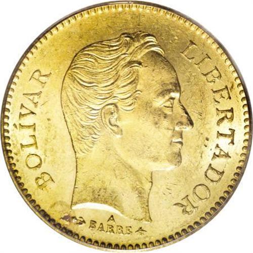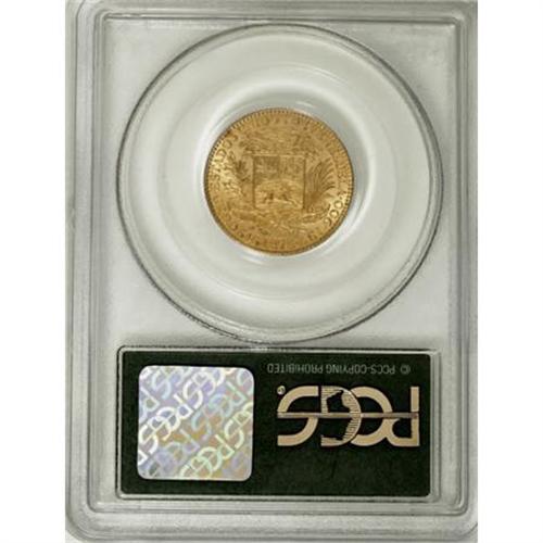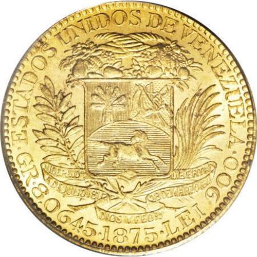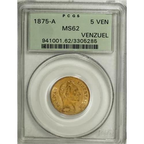<B>Republic gold 5 Venezolanos 1875A,</B></I> KM-Y17, MS62 PCGS, fully lustrous with light original toning, some tiny marks on the obverse. Scarce one-year type.<BR><BR><b>Shipping:</b> Coins & Currency (<a target="_blank" href="http://www.heritageauctions.com/common/shipping.php">view shipping information</a>)