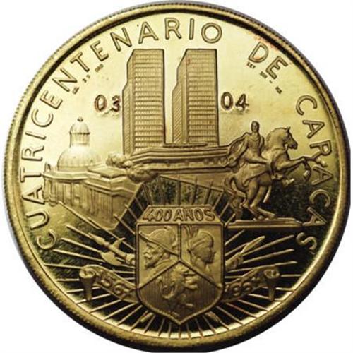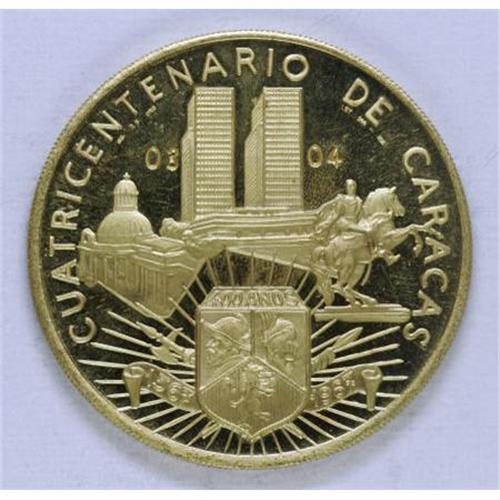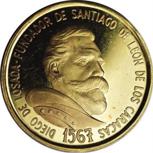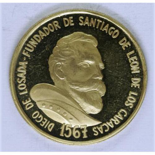 <B>Republic gold Commemorative Medal 1967, </B></I> this handsome issue marks the 400th anniversary of the founding of Caracas in 1567 by Diego De Losada, and features his bust on the obverse with modern buildings and statues on the reverse. Nice cameo Proof, faint hairlines in the exposed fields. Stamped 03 04 on the reverse, perhaps indicating the 304th struck. 40.5 mm, 35.0 grams, .900 fine.<BR><BR><b>Shipping:</b> Coins & Currency (<a target="_blank" href="http://www.heritageauctions.com/common/shipping.php">view shipping information</a>)