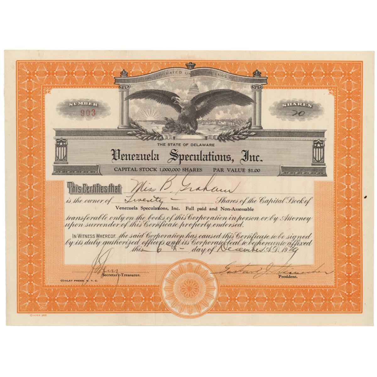1929, Delaware. Stock certificate for twenty shares. Orange / Black. Vignette of an eagle at top center. Crease at left center. Overall Very Fine.