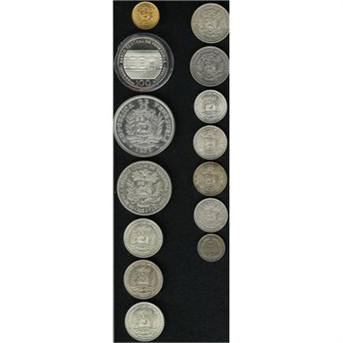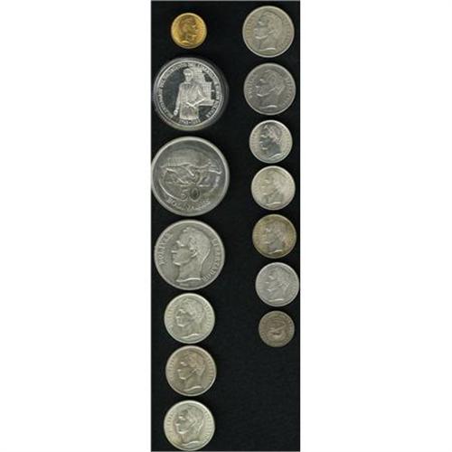 <B>Venezuela Type & Date Selection,</B></I> a useful group of 14 coins from this popular country featuring: KM-Y27 5 Centimos 1938 toned UNC, KM-Y22 Bolivar 1926 XF, 1936 (2) toned AU-UNC and BU, KM-Y22a Bolivar 1945 BU, KM-Y23 2 Bolivares 1926 XF, 1929 AU, KM-Y23a 2 Bolivares 1945 (3), all UNC, KM-Y24.2 5 Bolivares 1936 XF, KM-Y47 50 Bolivares 1975 Giant Armadillo, BU, KM-Y58 100 Bolivares (1983) Bolivar Proof and KM-Y31 gold 10 Bolivares 1930 BU. <B>Sold as is, no return lot.</B></I><BR><BR><b>Shipping:</b> Coins & Currency (<a target="_blank" href="http://www.heritageauctions.com/common/shipping.php">view shipping information</a>)