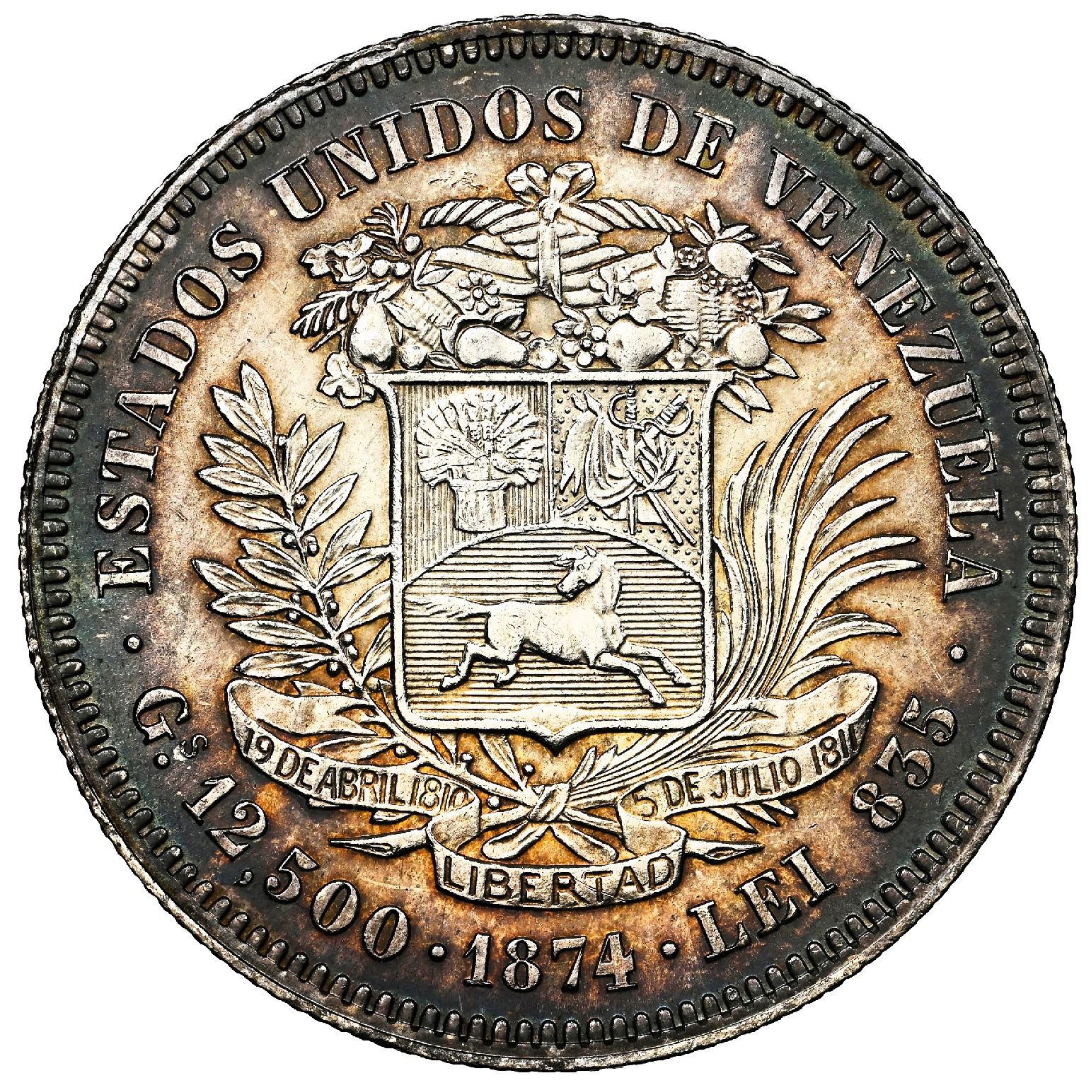 Venezuela (struck at the Paris Mint), 50 centavos, 1874-A, serifed A, NGC MS 62 ("top pop"). Stohr-35; KM-Y15. Choice strike with bold bust of Bolivar surrounded by die-polished fields and toned legends, the reverse even more ring-toned in rainbow colors over luster, very rare grade, tied with one other for finest known in NGC census. Please use this link to verify the certification number