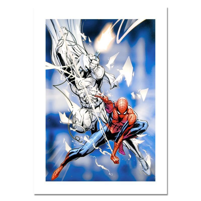 A piece of comic book history, this limited edition print, drawn by J. Scott Campbell, depicts famous characters from the classic Spider-Man series. Though he became famous for drawing for Wildstorm Comics, J. Scott Campbell now works on a Spider-Man series with Jeff Loeb. "Vengeance of the Moon Knight #9" is a limited edition giclee on canvas by J. Scott Campbell, numbered and hand signed by the artist. Includes Certificate of Authenticity! Measure approx. 15" x 22" (image).