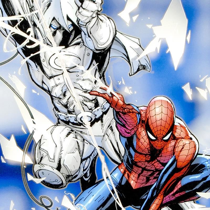 A piece of comic book history, this limited edition print, drawn by J. Scott Campbell, depicts famous characters from the classic Spider-Man series. Though he became famous for drawing for Wildstorm Comics, J. Scott Campbell now works on a Spider-Man series with Jeff Loeb. "Vengeance of the Moon Knight #9" is a numbered limited edition giclee on canvas by J. Scott Campbell presented by Marvel Comics and hand signed by the great Stan Lee. Includes Certificate of Authenticity! Measures approx. 15" x 22" (image).