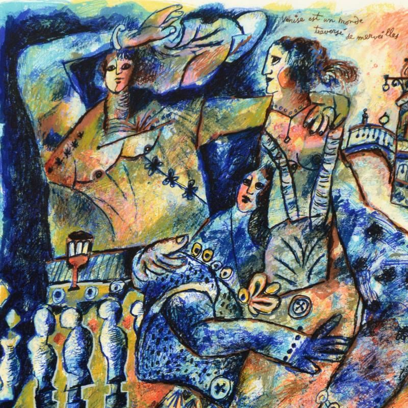 "Venice Est Un Monde" is a limited edition lithograph on paper by Theo Tobiasse (1927-2012), numbered and hand signed by the artist. Includes Letter of Authenticity. Measures approx. 22.5" x 30" (border), 21" x 28.5" (image).