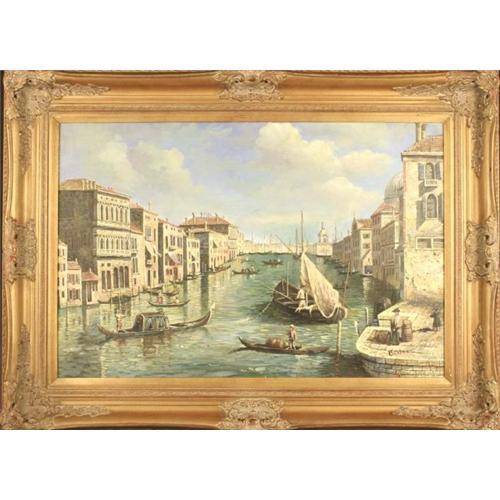 This panoramic bird?s eye view of Venice demonstrates this artist?s talent in depicting a bright, active boat scene with very fine, articulate brushwork. This modern painters? use of perspective accentuates the depth and realism of this lively water scene.
